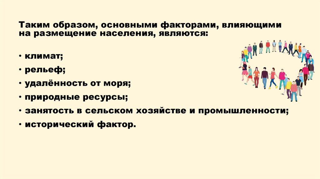 Таким образом, основными факторами, влияющимина размещение населения, являются: