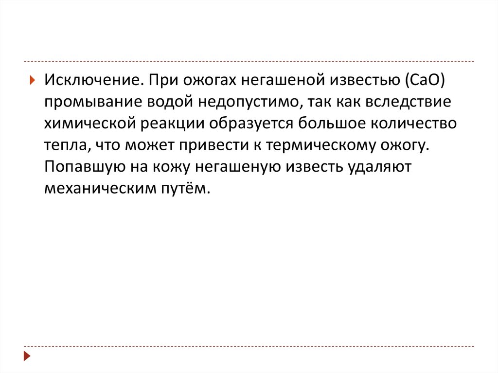 Исключение. При ожогах негашеной известью (CaO)промывание водой недопустимо, так как вследствие