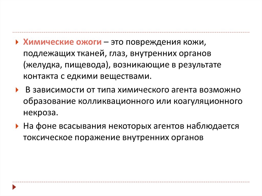 Химические ожоги – это повреждения кожи,подлежащих тканей, глаз, внутренних органов