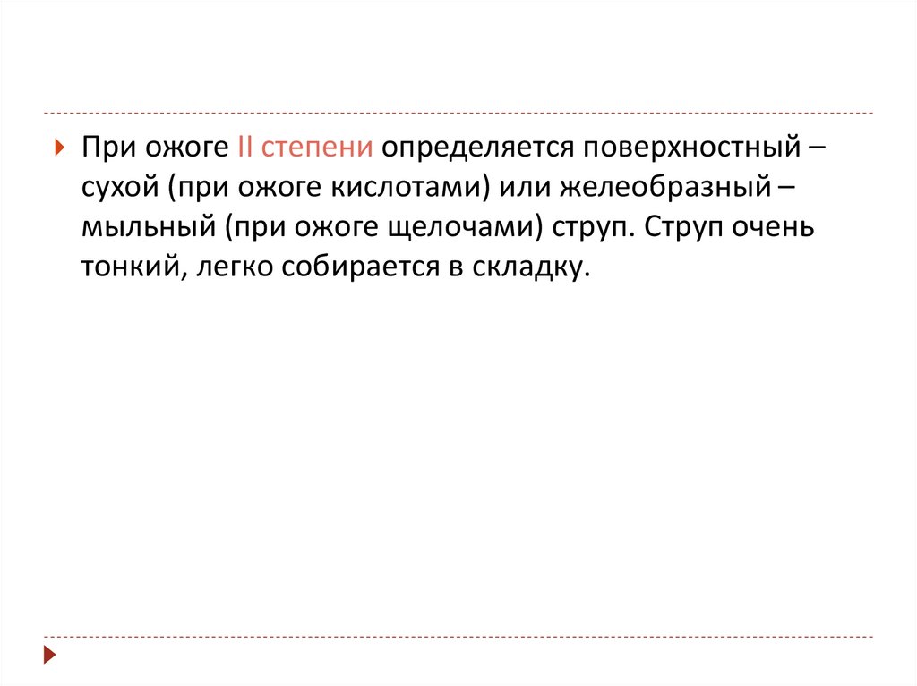 При ожоге II степени определяется поверхностный –сухой (при ожоге кислотами) или желеобразный –