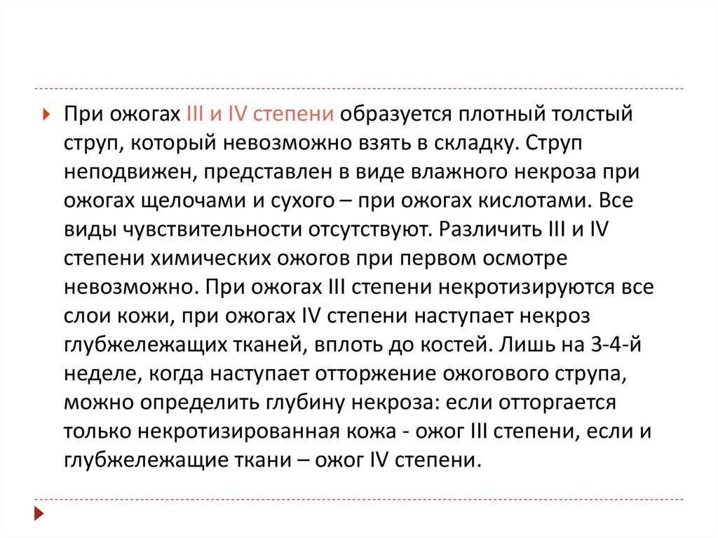 При ожогах III и IV степени образуется плотный толстыйструп, который невозможно взять в складку. Струп