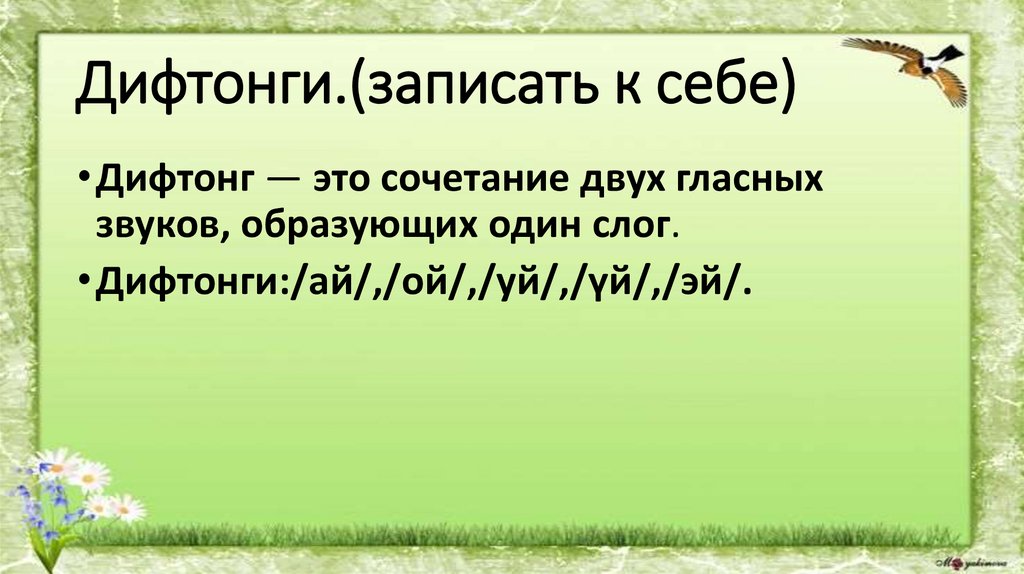 • Дифтонг — это сочетание двух гласныхзвуков, образующих один слог.