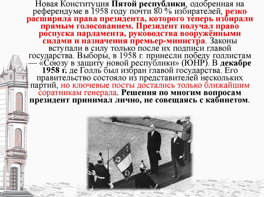 21. Отношения с СССР существенно улучшились. Де Голль и советский лидер Н. С. Хрущёв договорились о торговом, научном и культурном