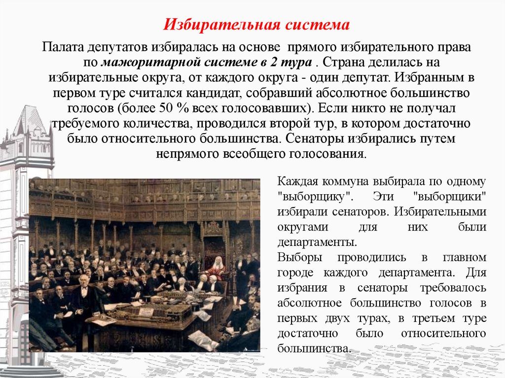 Избирательная системаПалата депутатов избиралась на основе прямого избирательного права