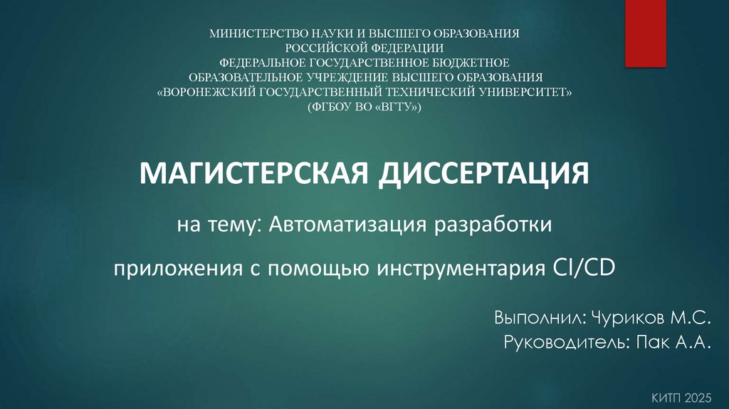 Целью ВКР является исследование и практическое доказательство, что всовременных автоматизированных процессах разработки, таких как