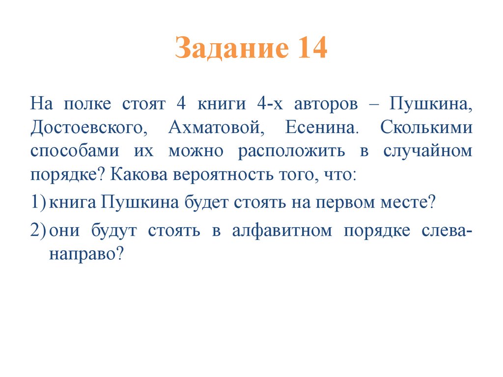 Задание 14На полке стоят 4 книги 4-х авторов – Пушкина,