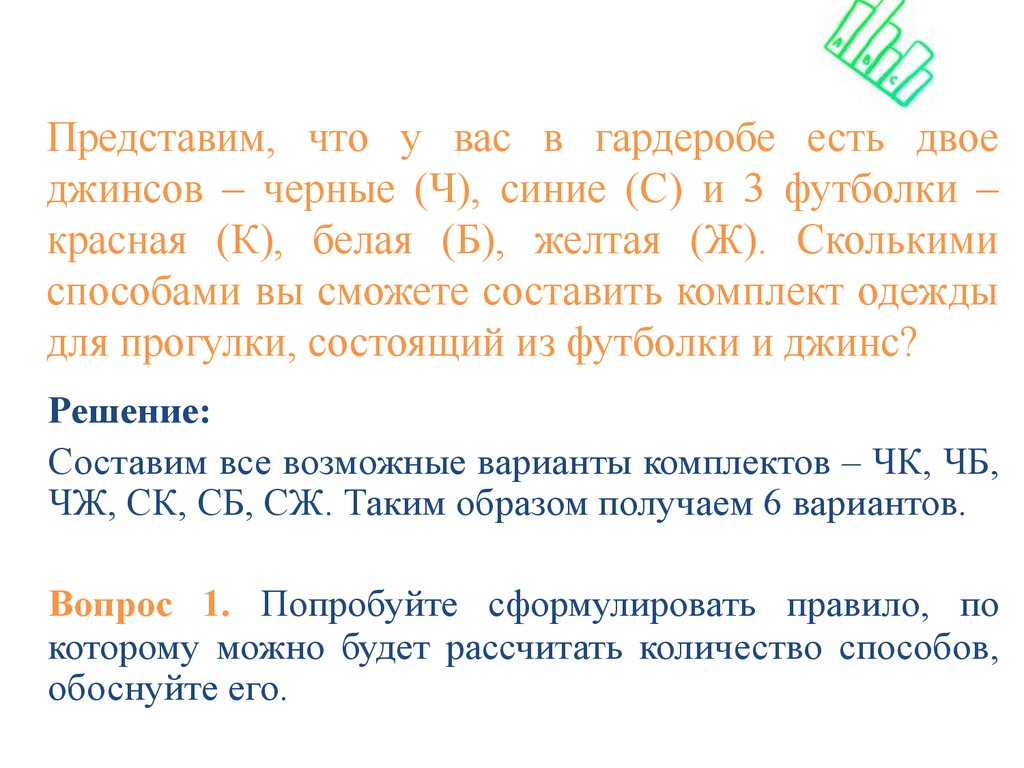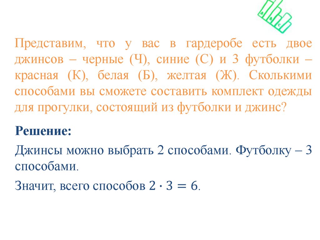 Представим, что у вас в гардеробе есть двоеджинсов – черные (Ч), синие (С) и 3 футболки –