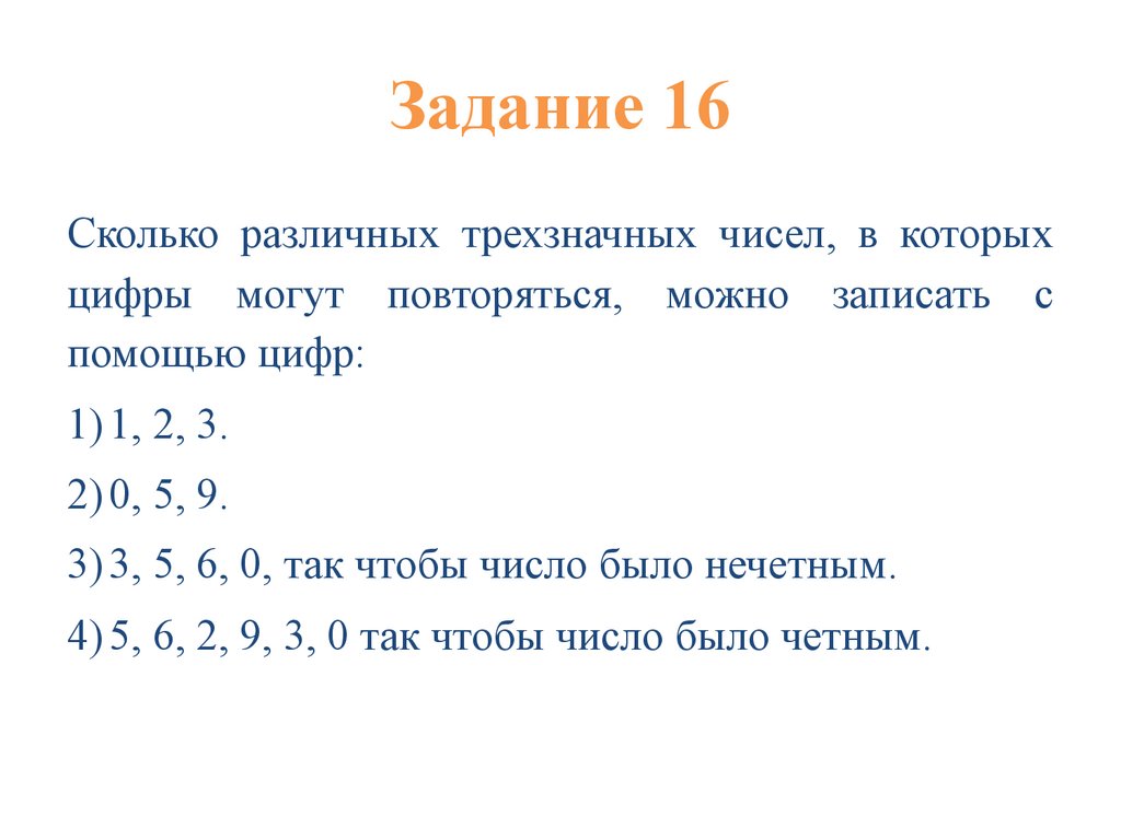 4) 5, 6, 2, 9, 3, 0 так чтобы число было четным.