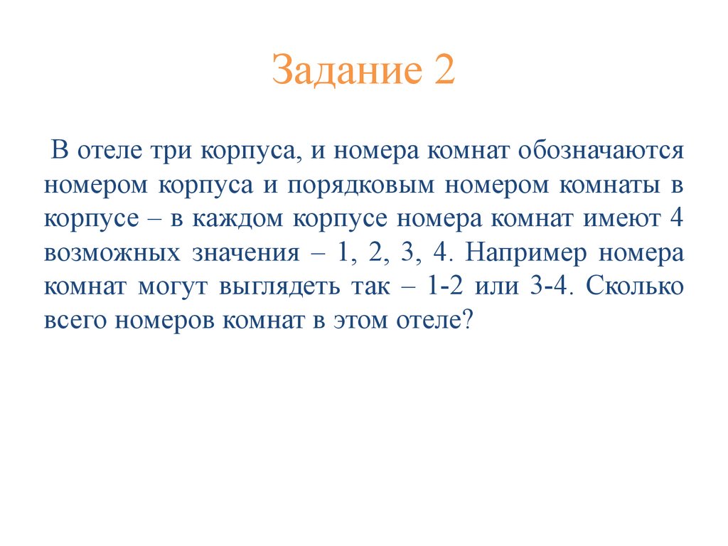 Задание 2В отеле три корпуса, и номера комнат обозначаются
