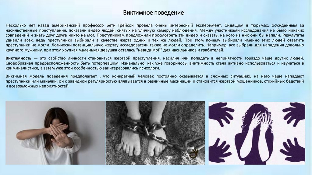 Виктимная модель поведения предполагает , что конкретный человек постоянно оказывается в сложных ситуациях, на него чаще нападают