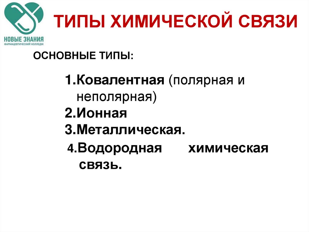 ТИПЫ ХИМИЧЕСКОЙ СВЯЗИОСНОВНЫЕ ТИПЫ: