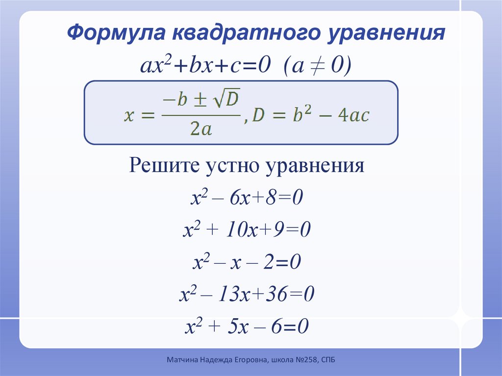 Формула квадратного уравненияax2+bx+c=0 (a ≠ 0)