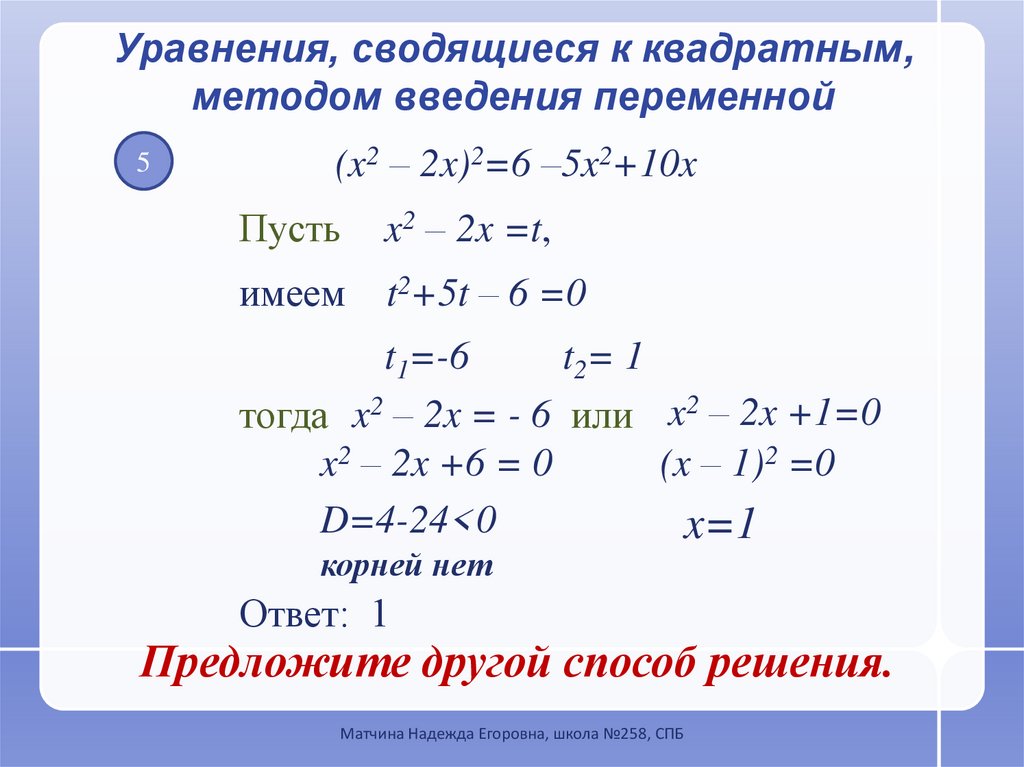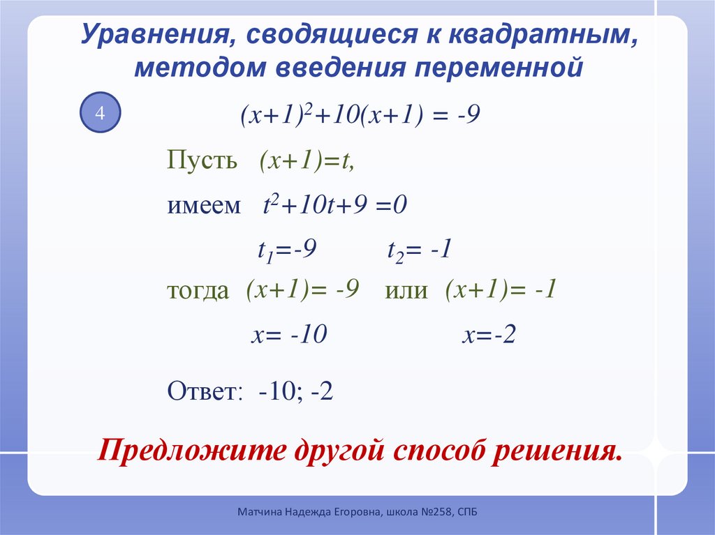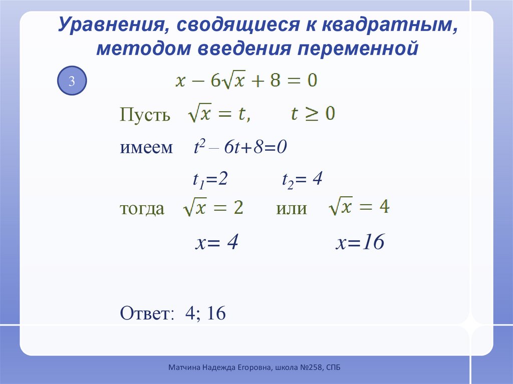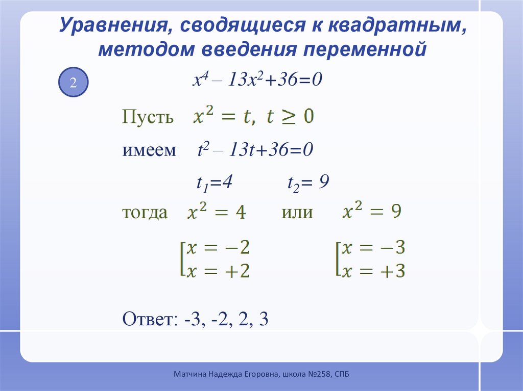 Уравнения, сводящиеся к квадратным,методом введения переменной