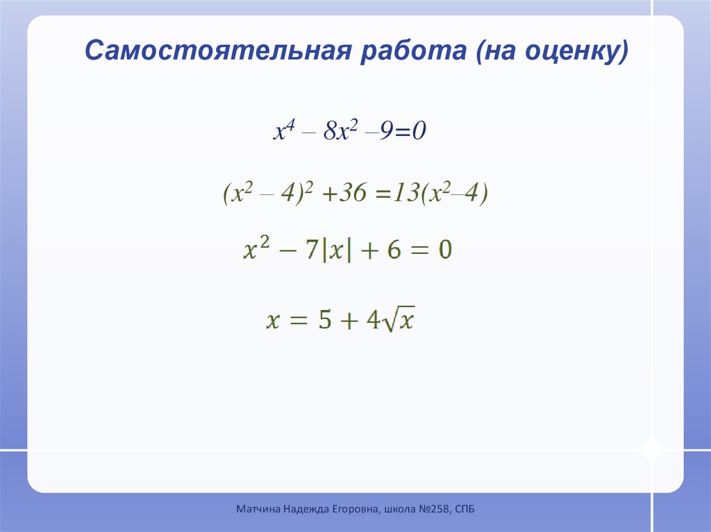 Самостоятельная работа (на оценку)x4 – 8x2 –9=0