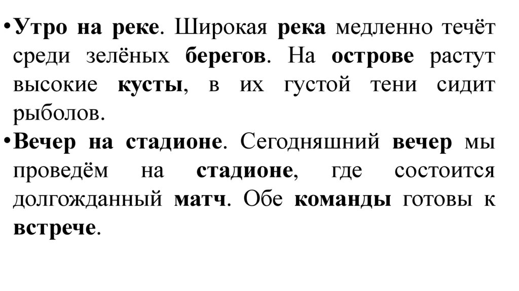 •1) Утро. Река. Остров. Кусты. В их густойтени сидит рыболов. 2) Вечер. Стадион. Матч.