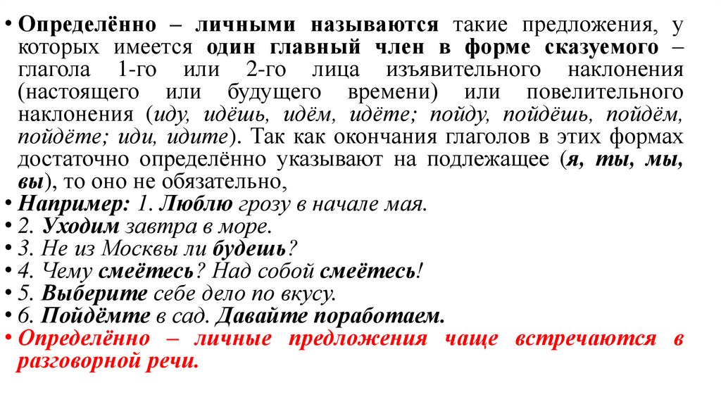 • Определённо – личными называются такие предложения, укоторых имеется один главный член в форме сказуемого –