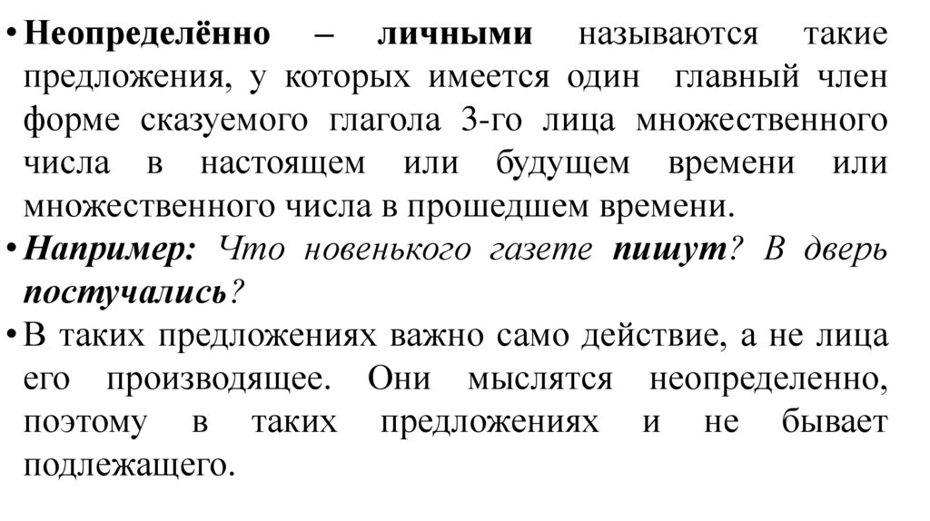• Неопределённо – личными называются такиепредложения, у которых имеется один главный член