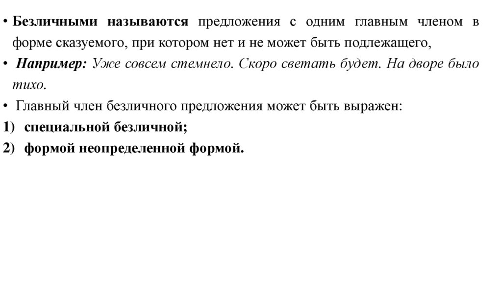 • Безличными называются предложения с одним главным членом вформе сказуемого, при котором нет и не может быть подлежащего,