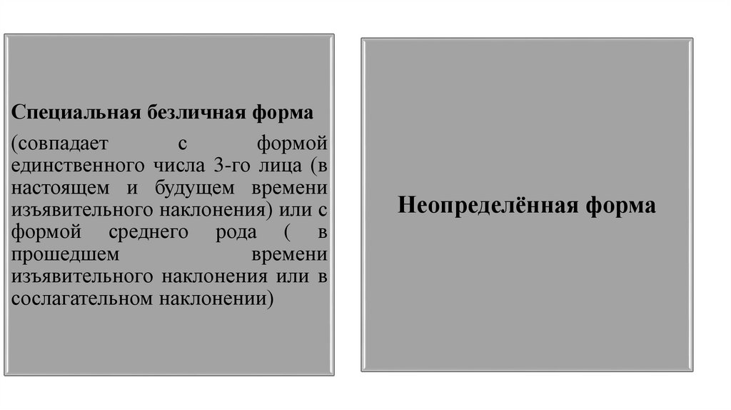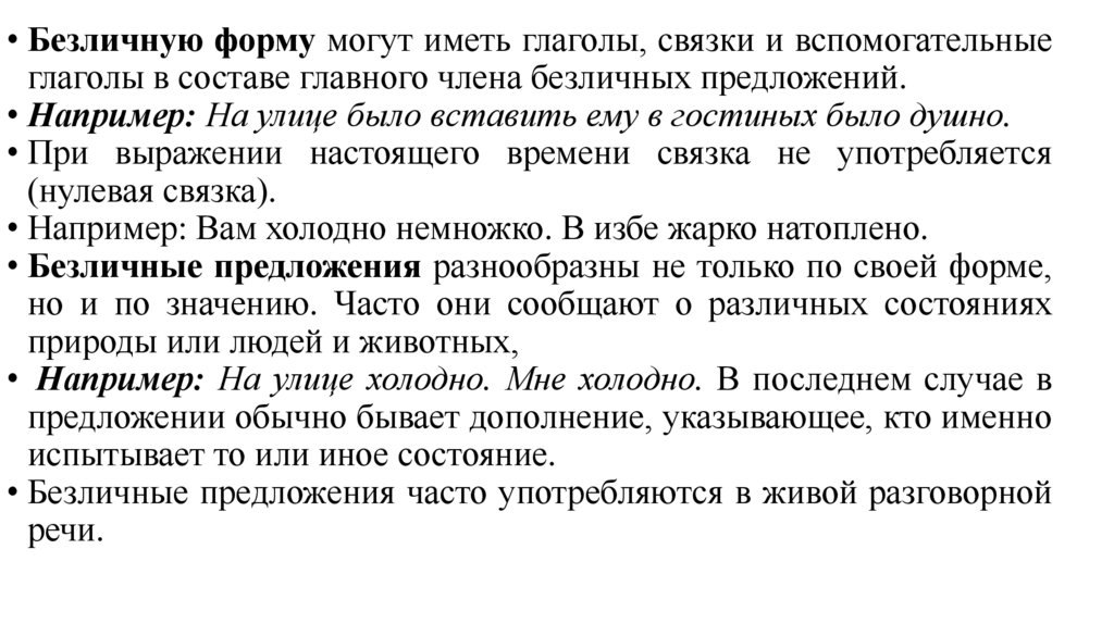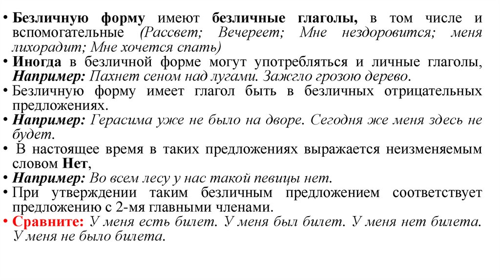 • Безличную форму имеют безличные глаголы, в том числе ивспомогательные (Рассвет; Вечереет; Мне нездоровится; меня