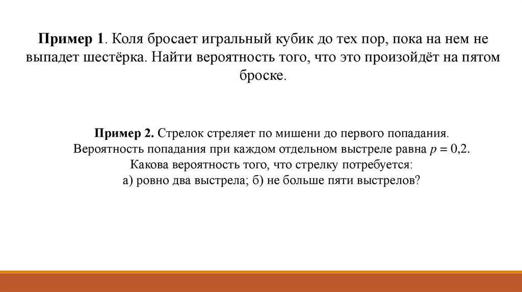 Пример 1. Коля бросает игральный кубик до тех пор, пока на нем невыпадет шестёрка. Найти вероятность того, что это произойдёт на пятом