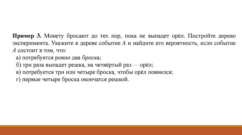 Пример 3. Монету бросают до тех пор, пока не выпадет орёл. Постройте деревоэксперимента. Укажите в дереве событие A и найдите его вероятность, если событие