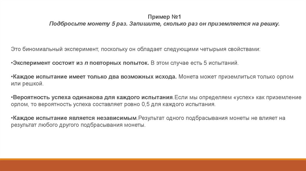 •Каждое испытание имеет только два возможных исхода. Монета может приземлиться только орлом