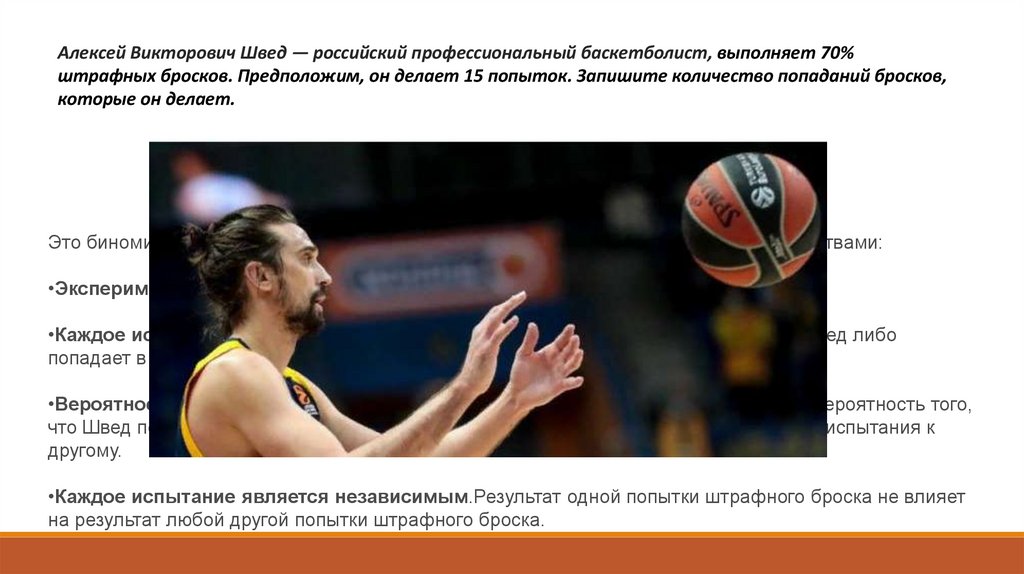 что Швед попадет в корзину, составляет 70%. Эта вероятность не меняется от одного испытания к
