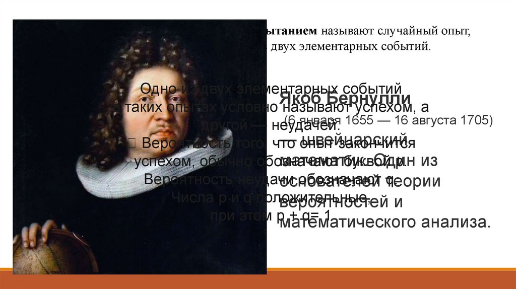 •Каждое испытание имеет только два возможных исхода. При каждой попытке Швед либо