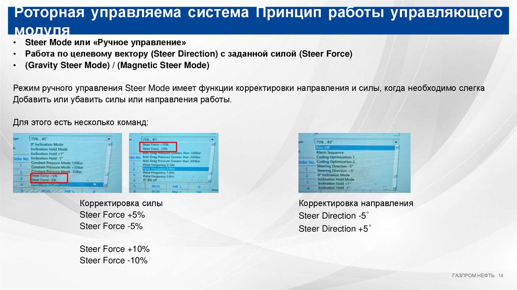 Steer Mode Работа по целевому вектору «Steer Direction» с заданной силой «Steer Force» «Ручное управление»