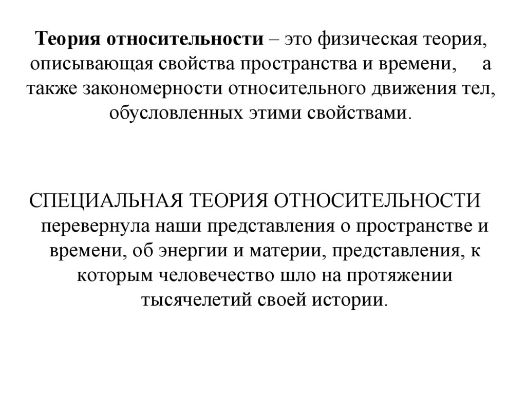 Теория относительности – это физическая теория,описывающая свойства пространства и времени, а