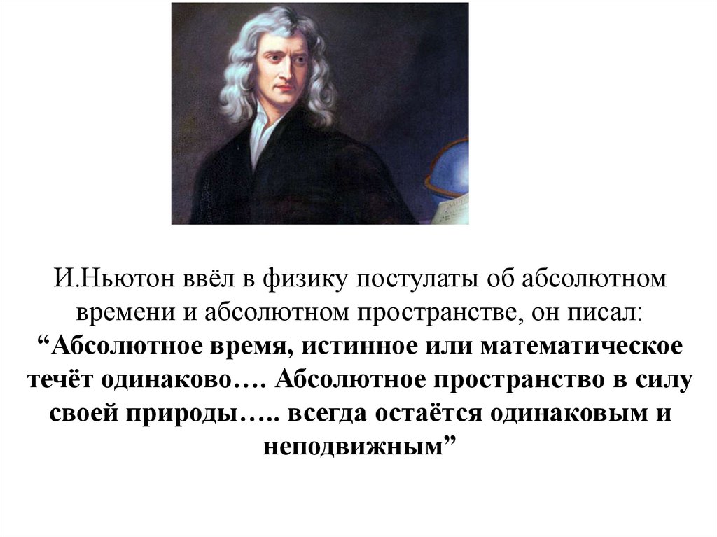 И.Ньютон ввёл в физику постулаты об абсолютномвремени и абсолютном пространстве, он писал: