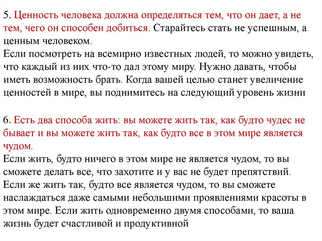5. Ценность человека должна определяться тем, что он дает, а нетем, чего он способен добиться. Старайтесь стать не успешным, а