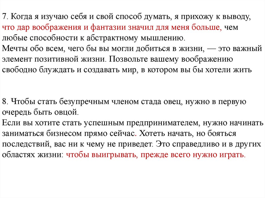 7. Когда я изучаю себя и свой способ думать, я прихожу к выводу,что дар воображения и фантазии значил для меня больше, чем