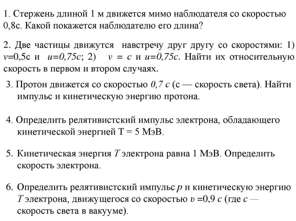 1. Стержень длиной 1 м движется мимо наблюдателя со скоростью0,8с. Какой покажется наблюдателю его длина?