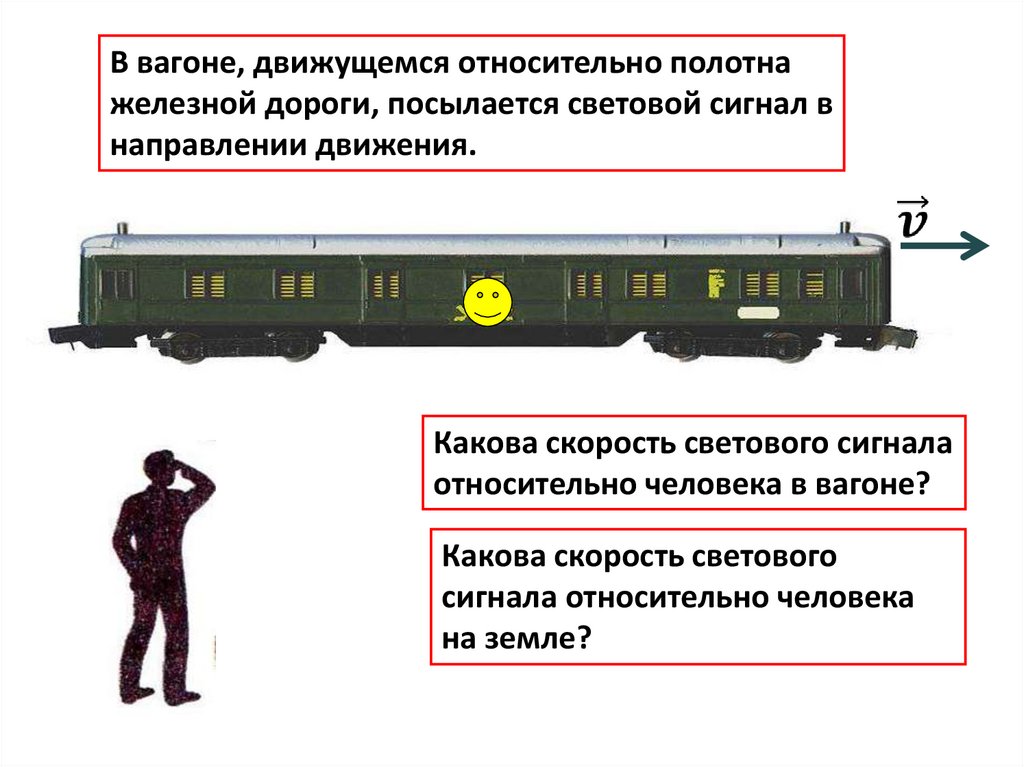 В вагоне, движущемся относительно полотнажелезной дороги, посылается световой сигнал в