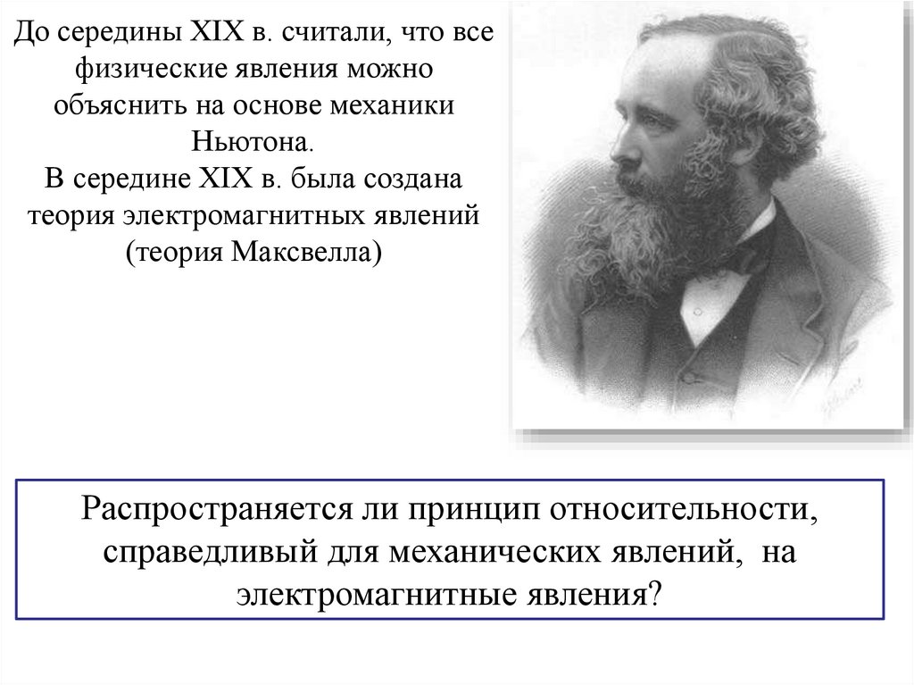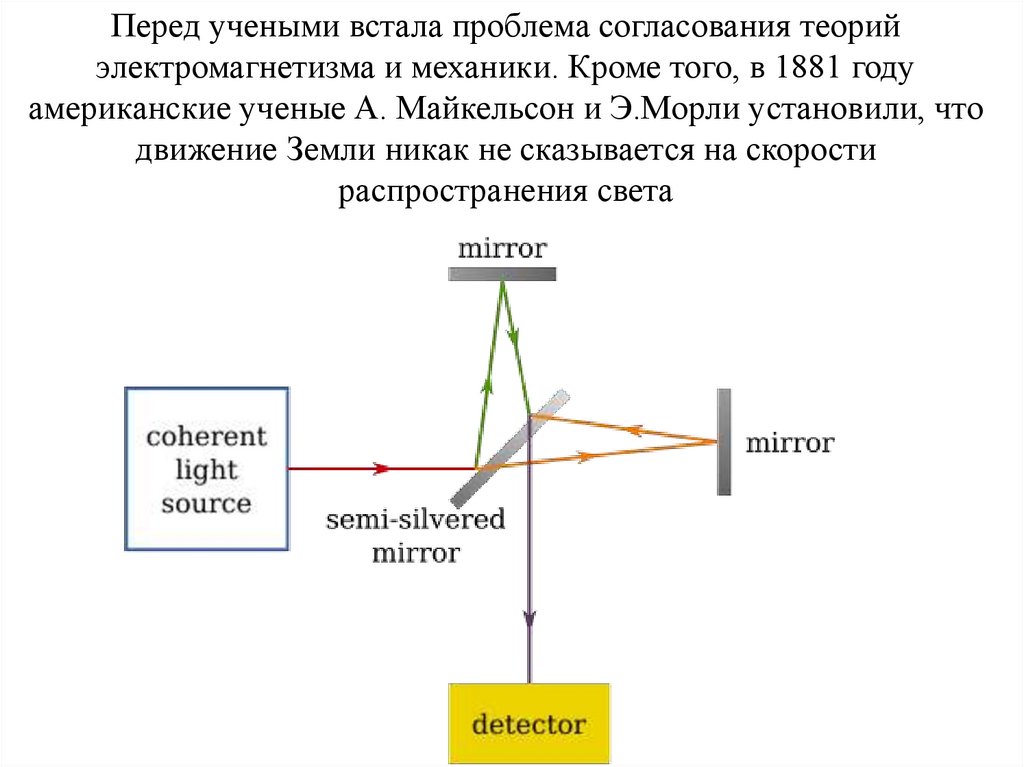 Перед учеными встала проблема согласования теорийэлектромагнетизма и механики. Кроме того, в 1881 году