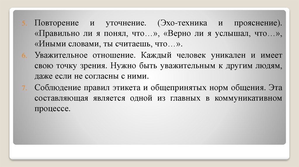 проверки его точности), отражение чувств (отражение слушающим