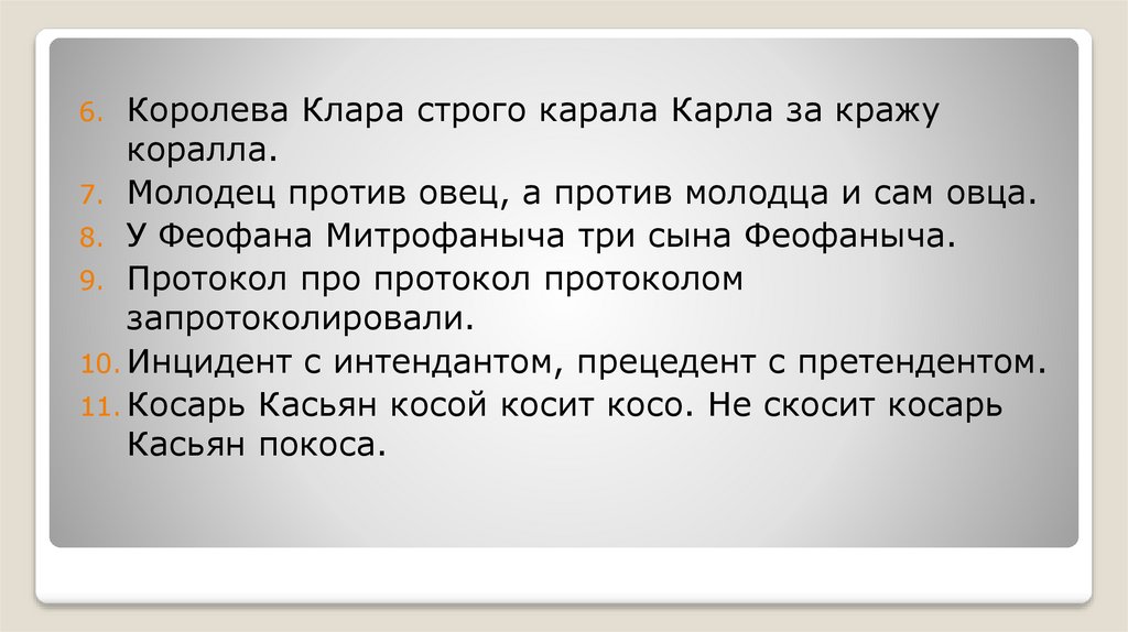 11. Косарь Касьян косой косит косо. Не скосит косарь
