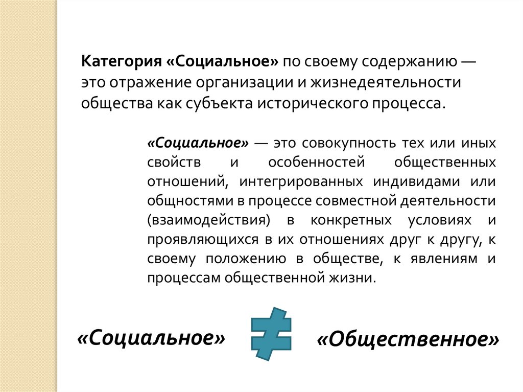 Категория «Социальное» по своему содержанию —это отражение организации и жизнедеятельности