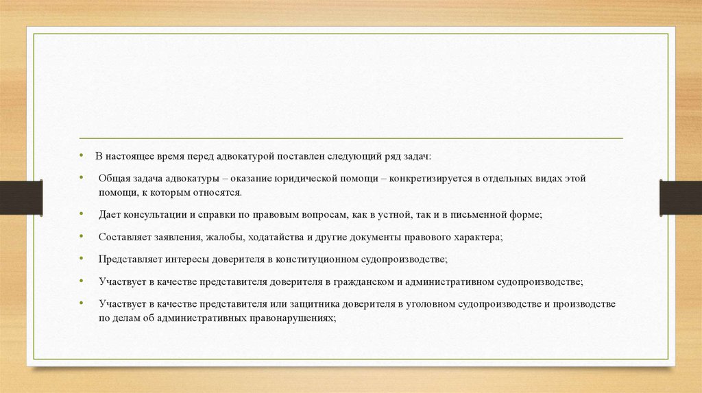 • В настоящее время перед адвокатурой поставлен следующий ряд задач:Общая задача адвокатуры – оказание юридической помощи – конкретизируется в отдельных видах этой