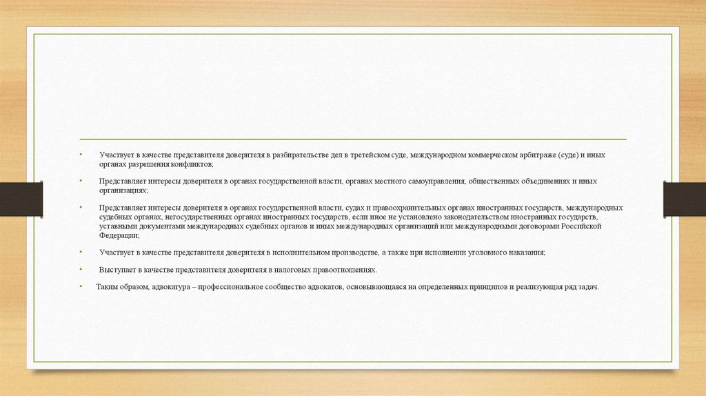Таким образом, адвокатура – профессиональное сообщество адвокатов, основывающаяся на определенных принципов и реализующая ряд задач.