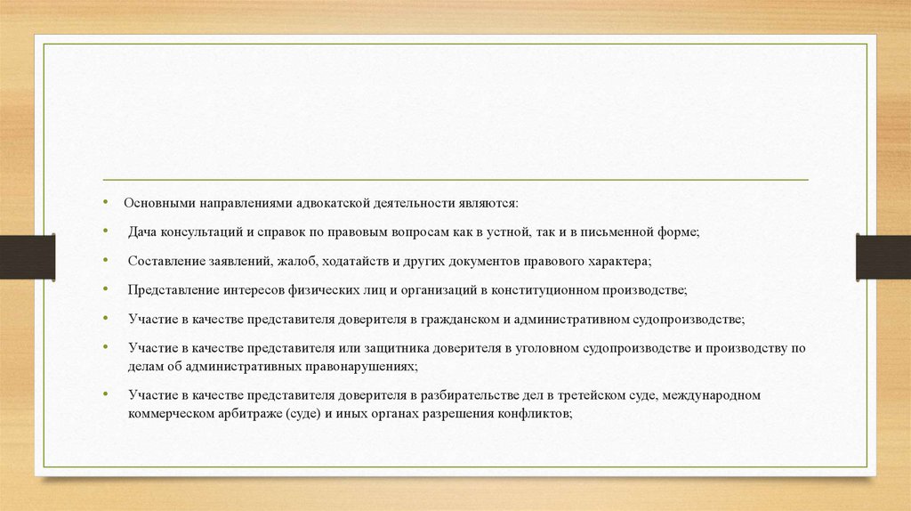 • Основными направлениями адвокатской деятельности являются:Дача консультаций и справок по правовым вопросам как в устной, так и в письменной форме;
