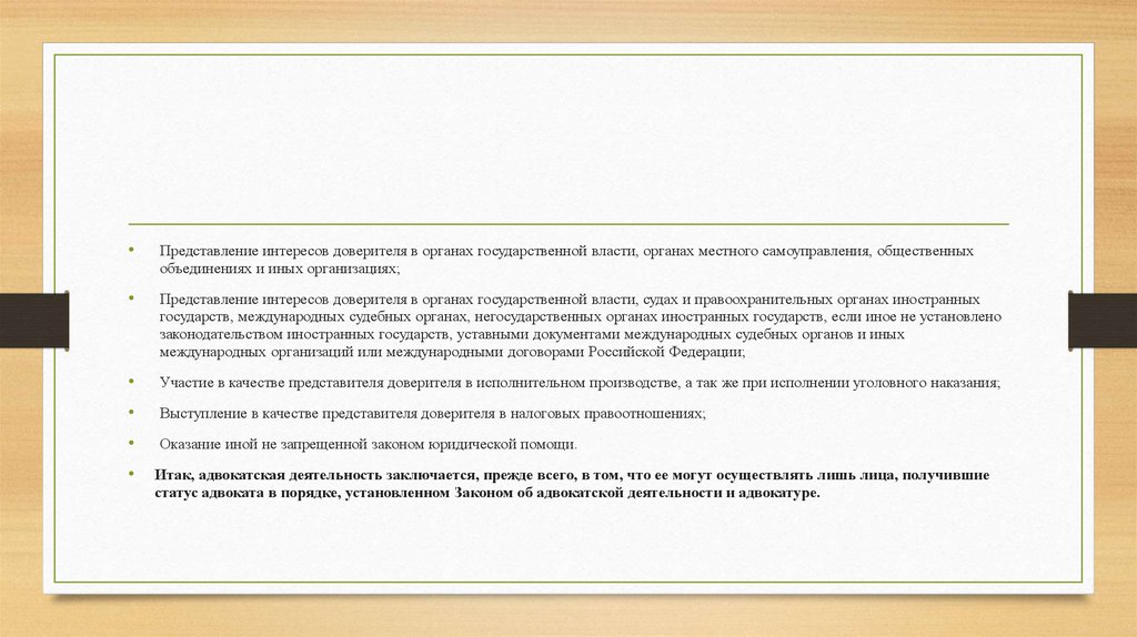 Итак, адвокатская деятельность заключается, прежде всего, в том, что ее могут осуществлять лишь лица, получившие