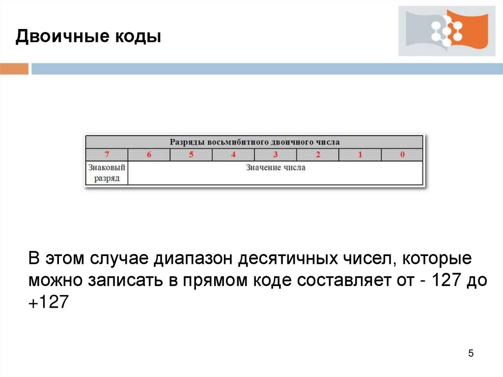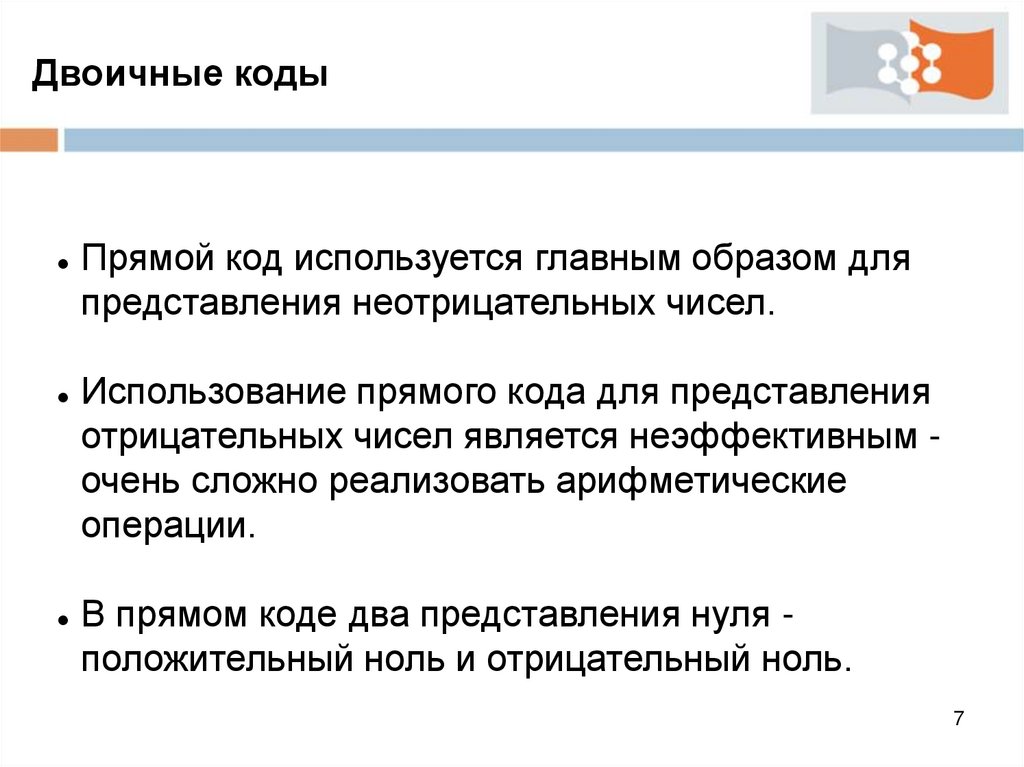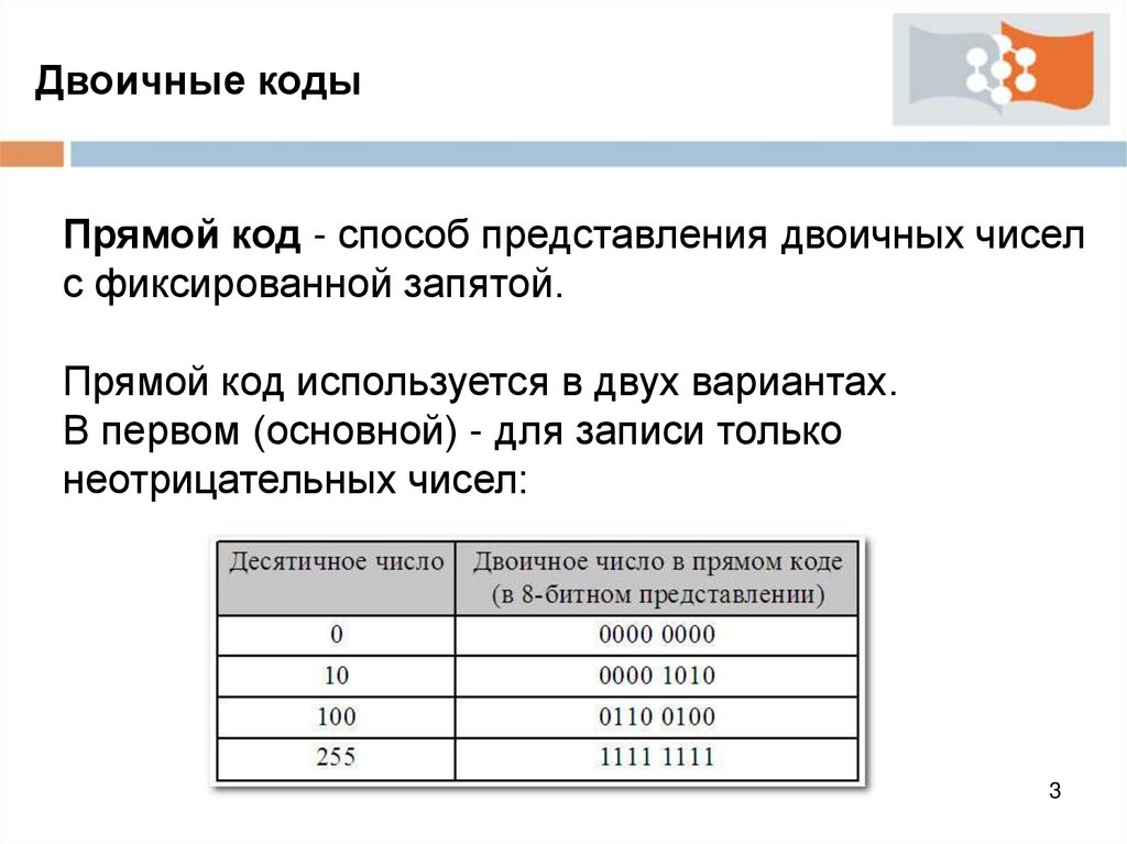 Двоичные кодыПрямой код используется главным образом для