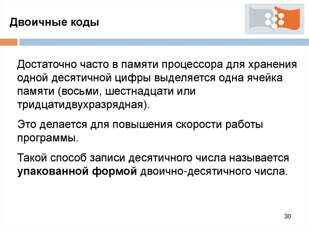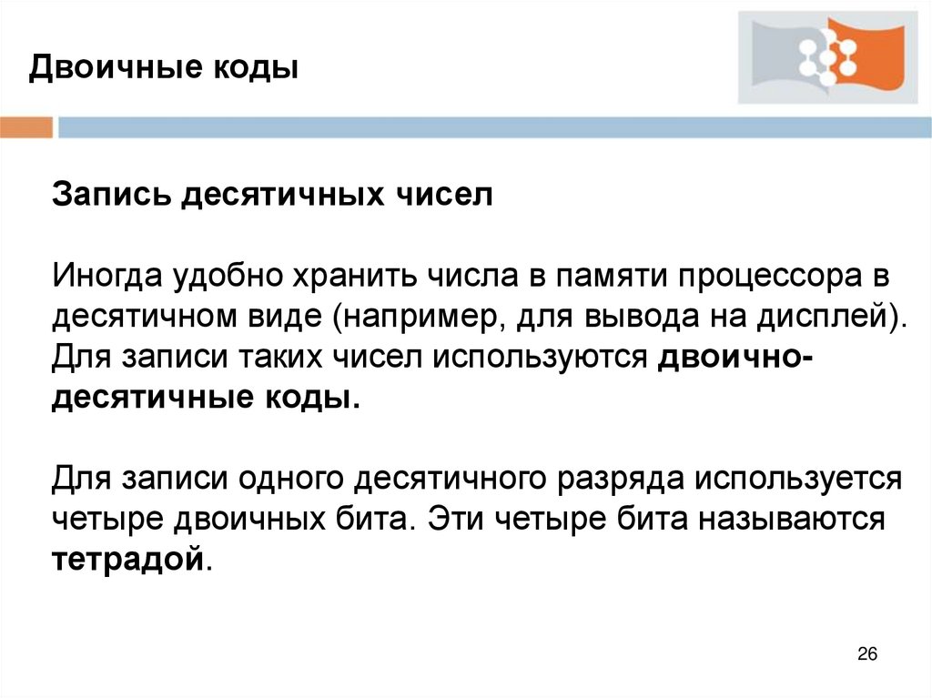 Двоичные кодыДостаточно часто в памяти процессора для хранения