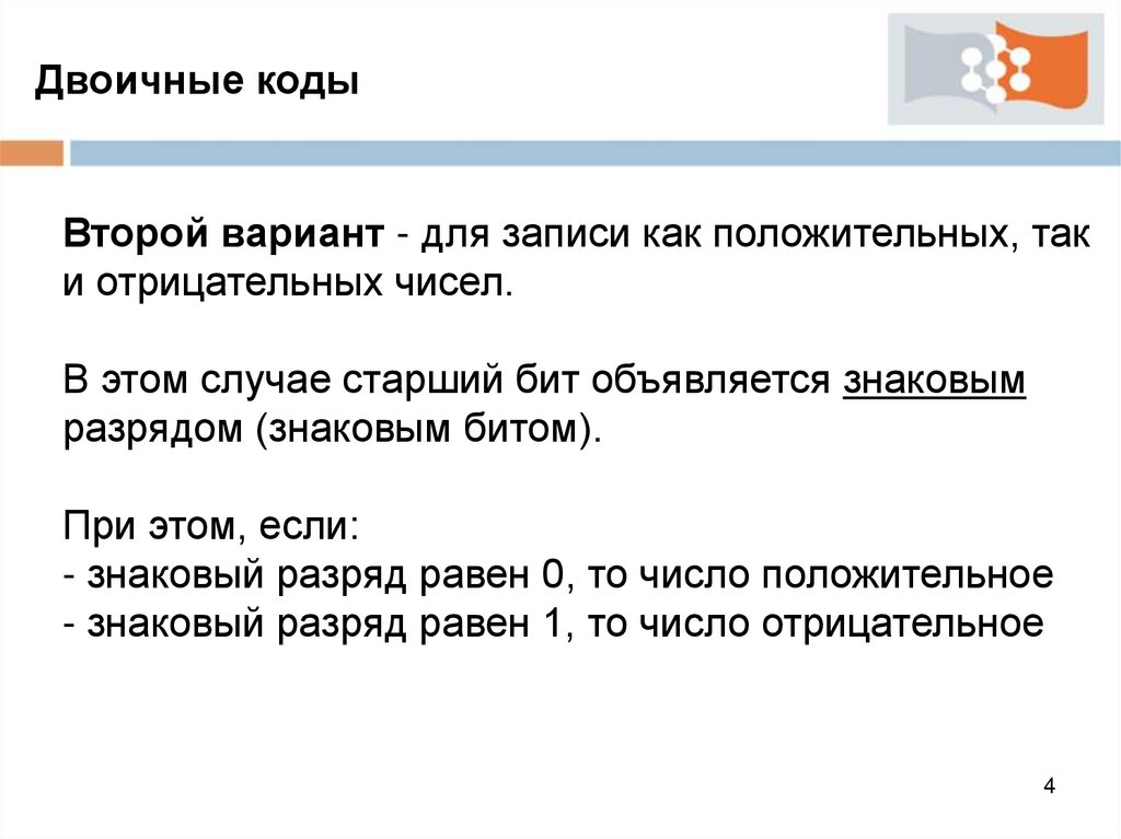 Двоичные кодыВторой вариант - для записи как положительных, так