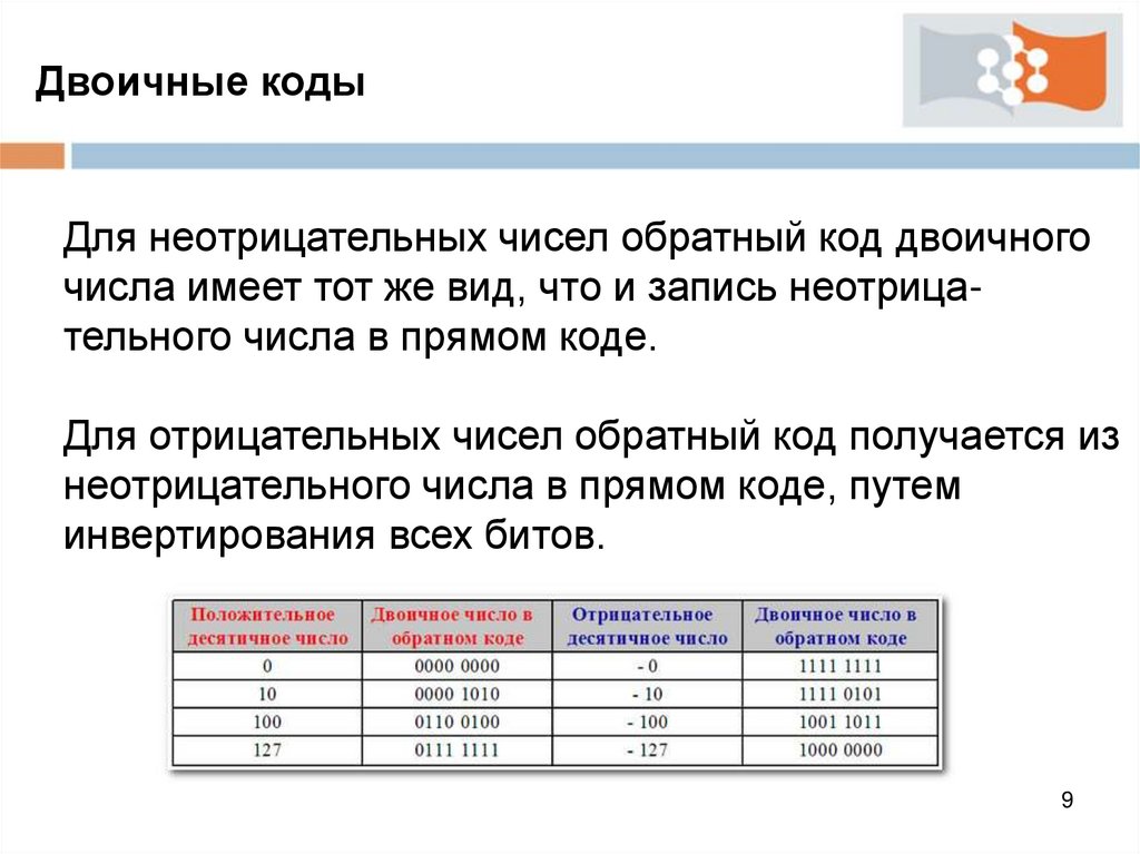 Двоичные кодыДля неотрицательных чисел обратный код двоичного