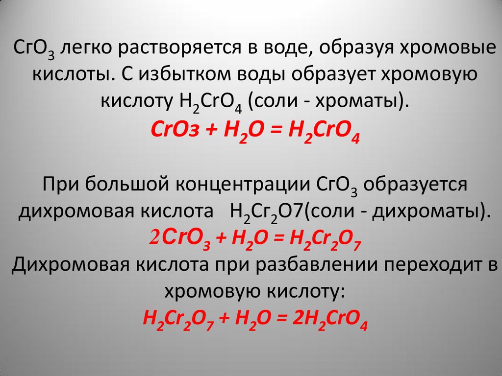 СгО3 легко растворяется в воде, образуя хромовыекислоты. С избытком воды образует хромовую