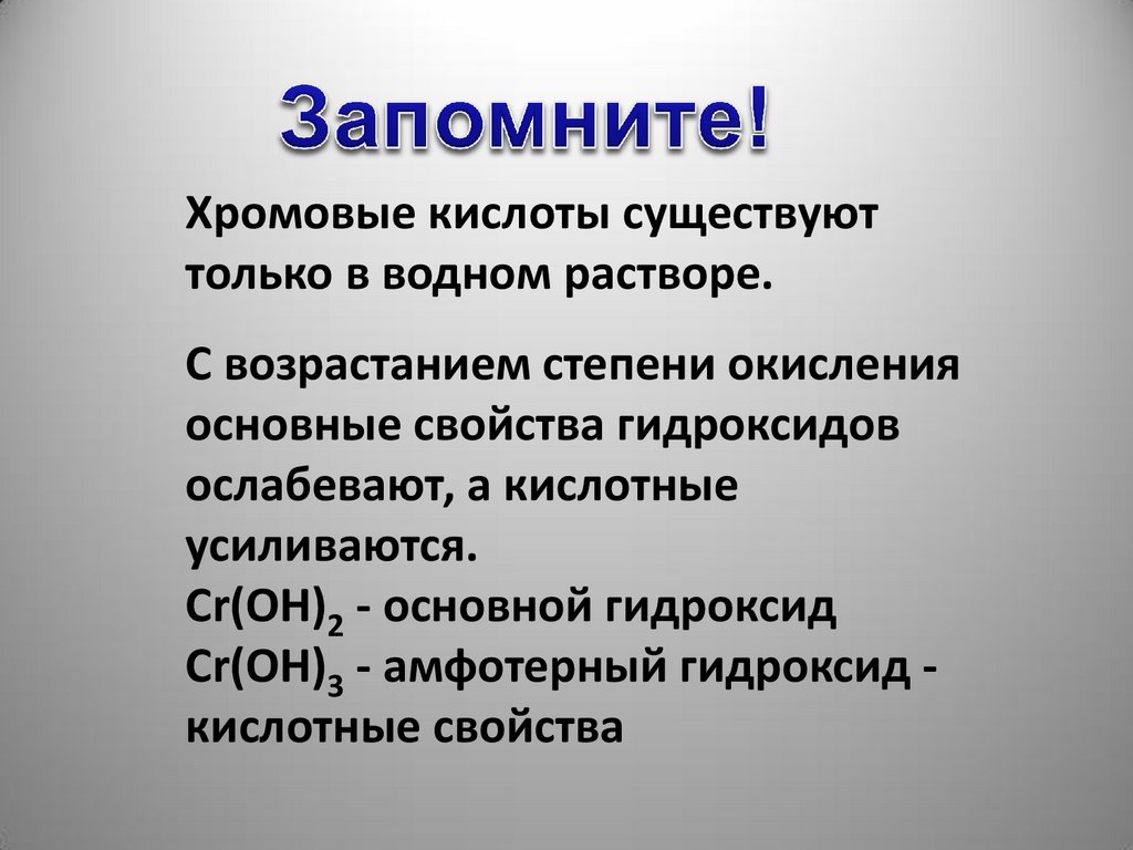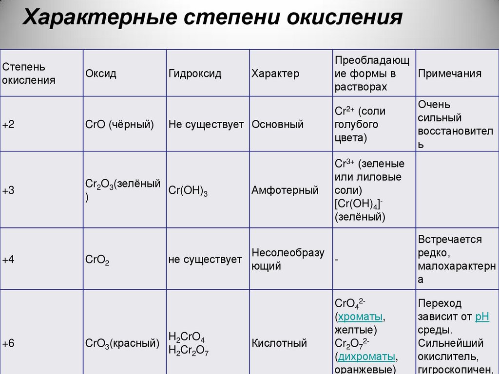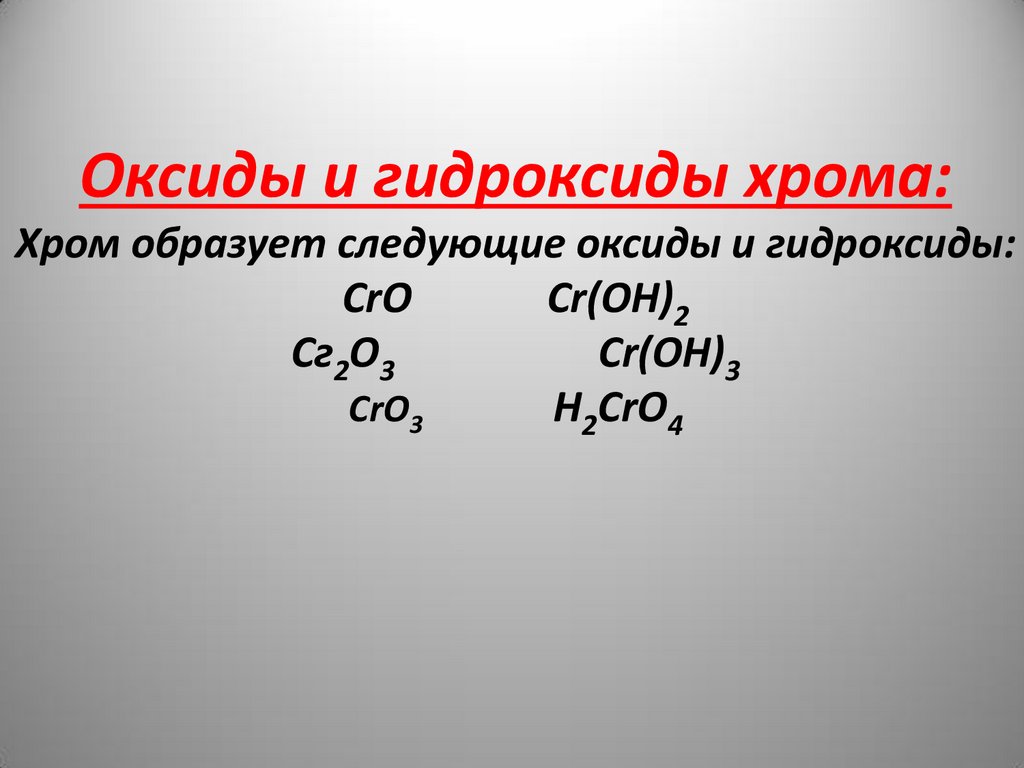 Оксиды и гидроксиды хрома:Хром образует следующие оксиды и гидроксиды: