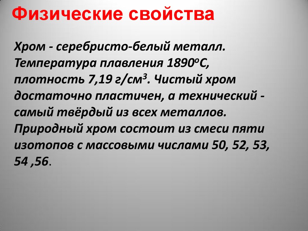 Физические свойстваХром - серебристо-белый металл.
